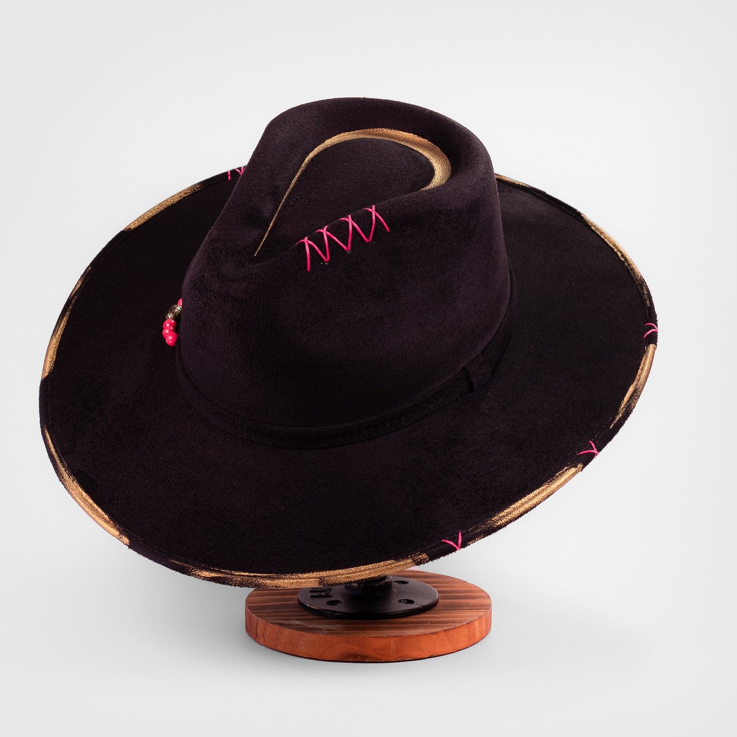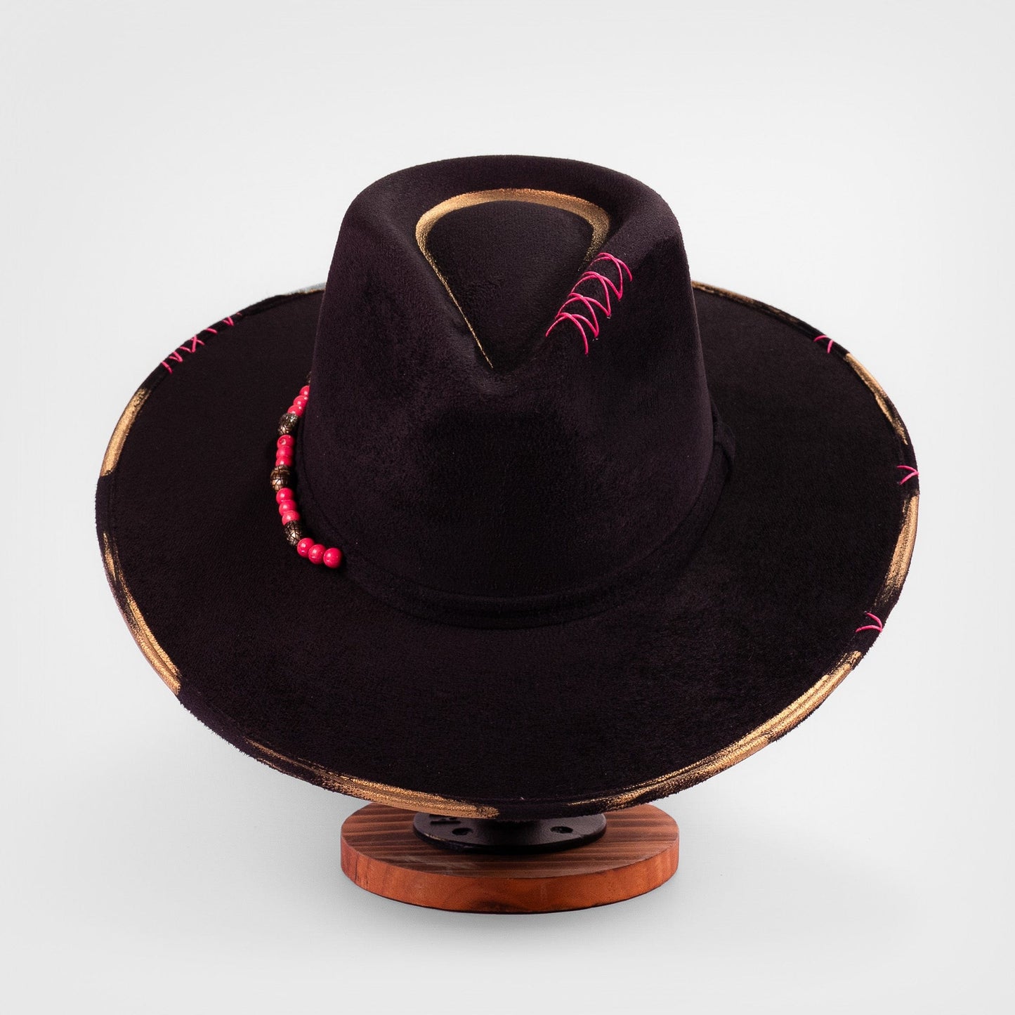 Handcrafted Boho Ajaw Obsidiana Hat – Black Suede Fedora with Gold Trim & Pink Beaded Accent