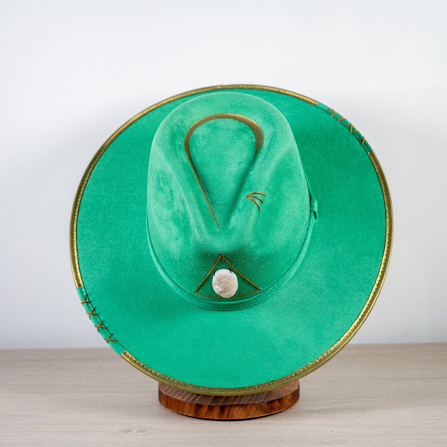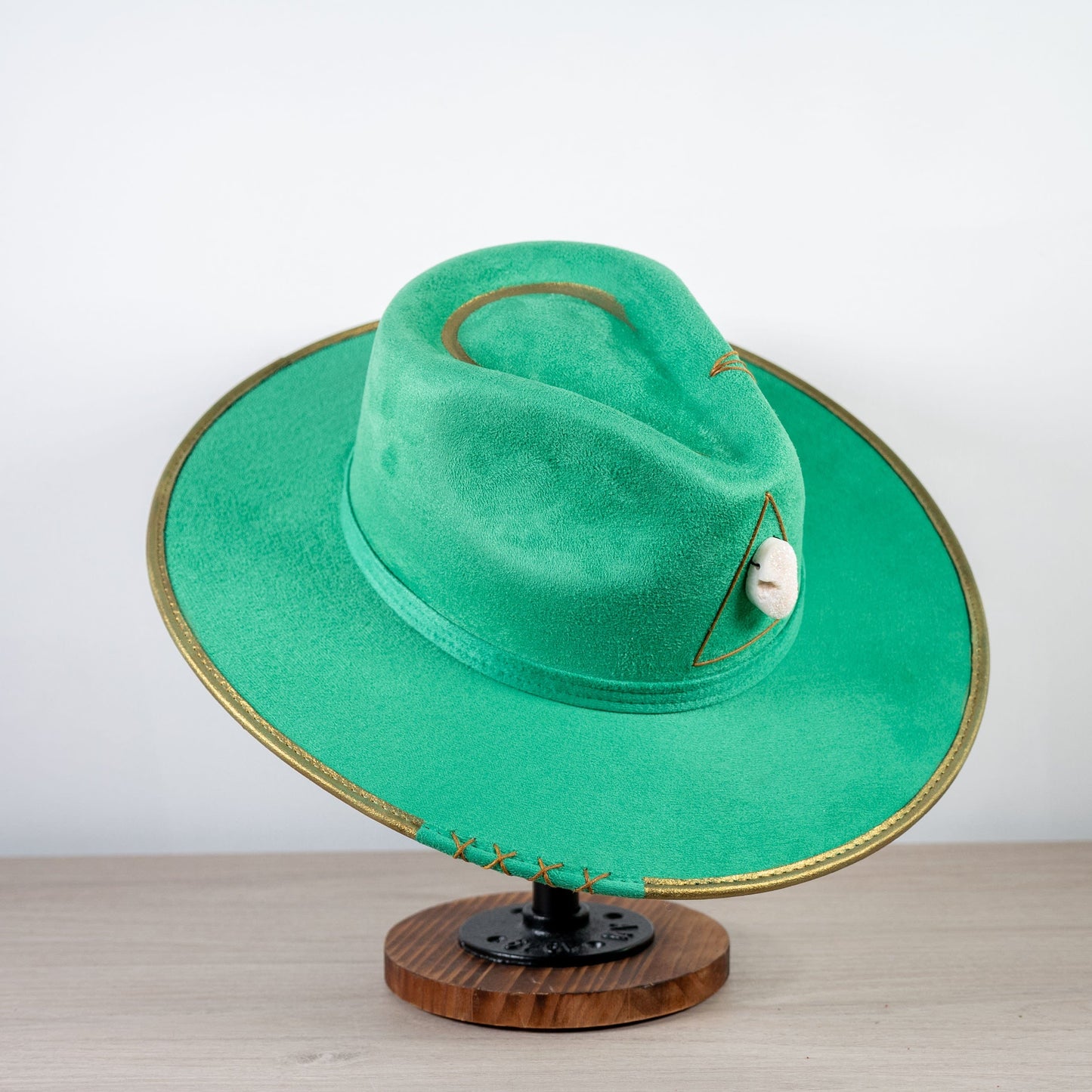 Handcrafted Boho Emerald Spirit Hat – Green Suede Fedora with Gold Trim & Agate Stone Accent